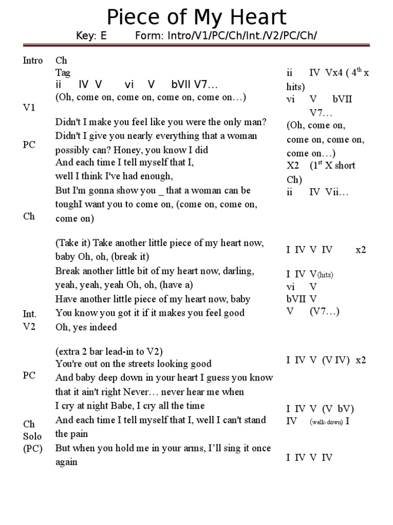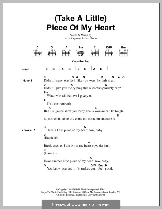 Take another little piece of my heart now baby. Take another little piece of my heart now baby. Honey you know I did.