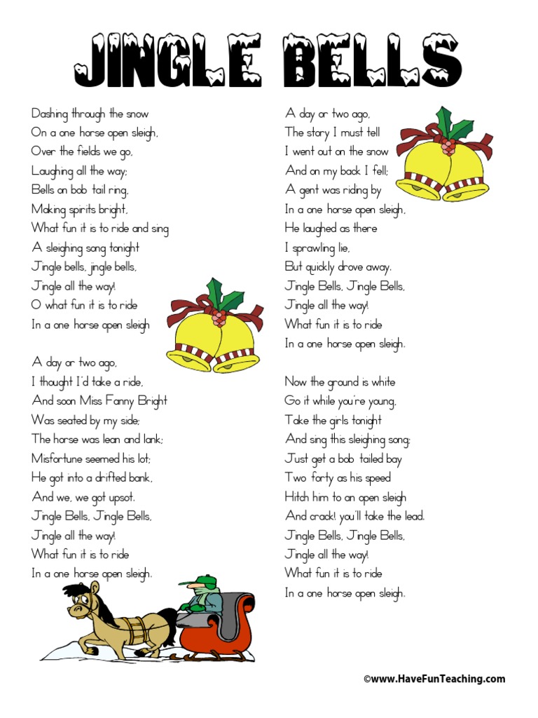 Natal - Jingle Bells One Horse Open Sleigh Letra e música para ouvir - Jingle bells jingle bells Jingle all the way Oh what fun it is to ride In a one horse open sleigh LETRASMUSBR - Letras de músicas. Bells on bobtails ring Making spirits bright What fun it is to ride and sing A sleighing song tonight.