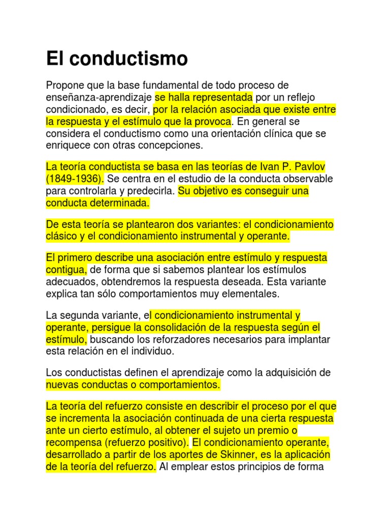 Según esta teoría el aprendizaje es el resultado de la asociación. Esta es la alternativa que propuso Skinner 1970 para convertir la enseñanza hasta entonces vista como un arte en una técnica sistemática. La teoría conductista se basa en las teorías de Ivan P. La teoría del refuerzo consiste en describir el proceso mediante el cual se incrementa la asociación continua de algunas respuestas ante un cierto estímulo al obtener el sujeto un medio o recompensa o también llamado refuerzo positivo. Aquellos que tienen éxito por aprender aprenden mejor. Proceso mediante el cual se aumenta o disminuye la probabilidad de dar una respuesta designando. Se aprende asociando estímulos con respuestas El aprendizaje está en función del entorno El aprendizaje no es duradero necesita ser reforzado El aprendizaje es memorístico repetitivo y mecánico y responde a estímulos. Responder a una prueba luego de haber estudiado. Entre las características del conductismo destacan las siguientes.