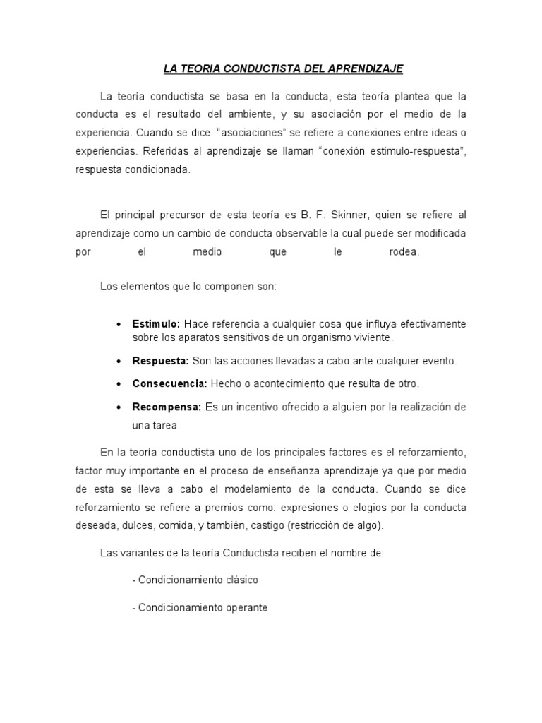 A esto se le. A continuación definimos los principales términos de la teoría conductista. Desde una perspectiva conductista el aprendizaje es entendido como un cambio observable en el comportamiento un proceso en el cual se adquieren habilidades destrezas conocimientos conductas o valores como resultado del estudio la experiencia la instrucción y la observación.